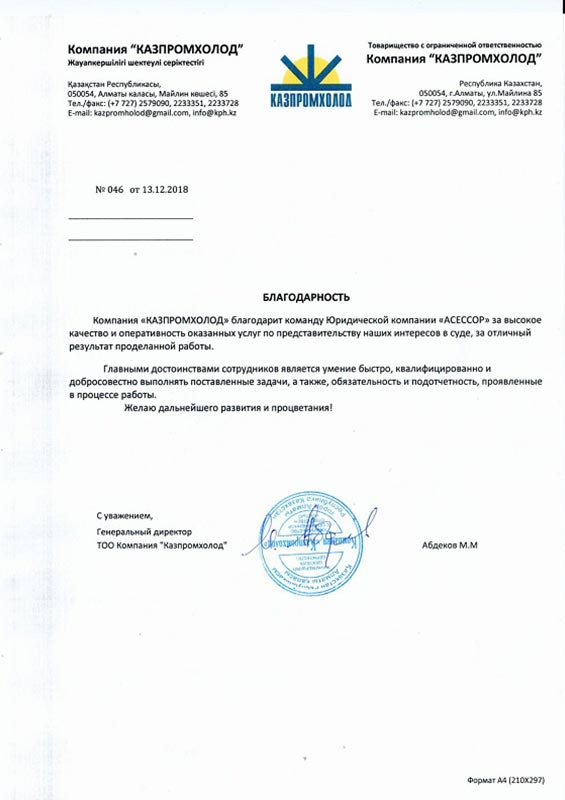 Компания «КАЗПРОМХОЛОД» благодарит команду Юридической компании «АСЕССОР» за высокое качество и оперативность оказанных услуг по представительству наших интересов в суде, за отличный результат проделанной работы.
